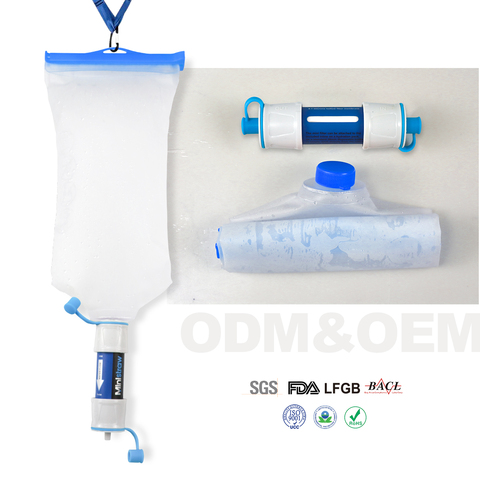 ตัวกรองน้ำแบบพับได้ TPU ถุงกรองน้ำดื่มสำหรับตั้งแคมป์เดินป่าเป็นมิตรต่อสิ่งแวดล้อม